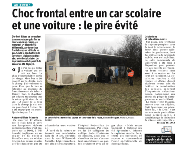 Apres l’accident, la municipalité de Willerwald a ouvert les portes de la salle polyvalente aux enfants choqués mais indemnes du bus accidenté. Ils ont ainsi pu se réchauffer et se désaltérer avant l’arrivée des parents.