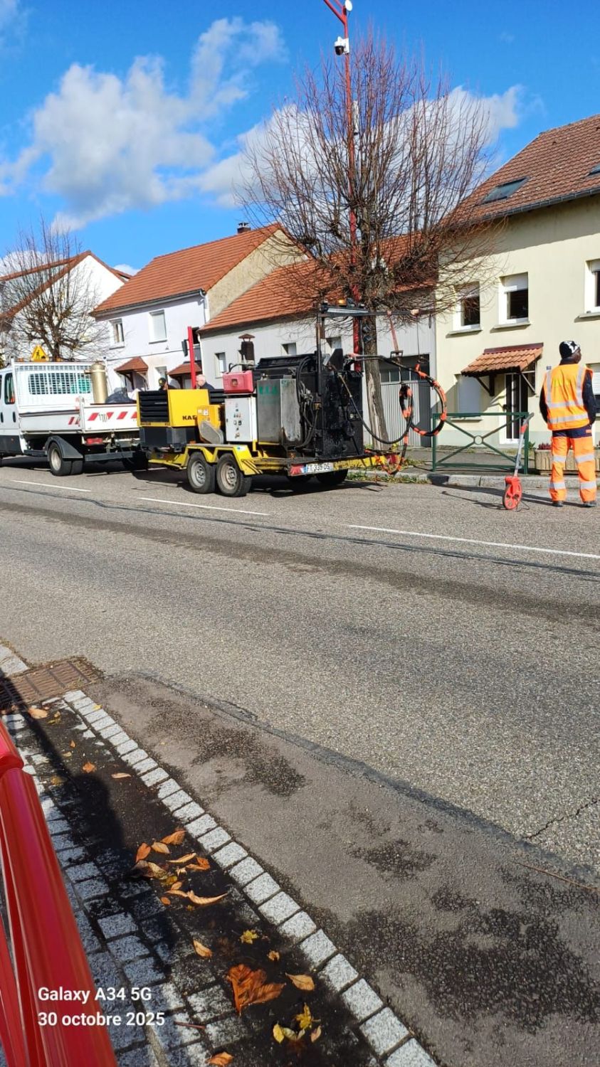 ENTRETIEN DE LA CHAUSSEE Article publié le 19 novembre 2025 Le Département a procédé récemment au colmatage des fissures dans la chaussée à l'aide de bitume liquide sur l'ensemble de la rue Principale, dans la traversée de la commune.