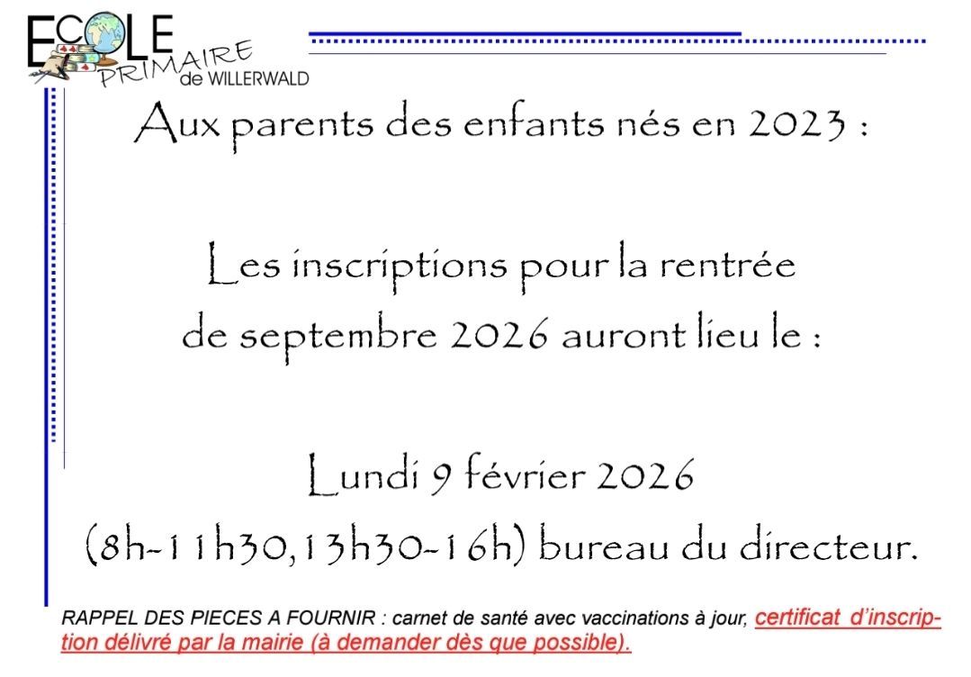 INSCRIPTION ECOLE Article publié le 9 janvier 2026 L'inscription des enfants nés en 2023 aura lieu le lundi 9 février