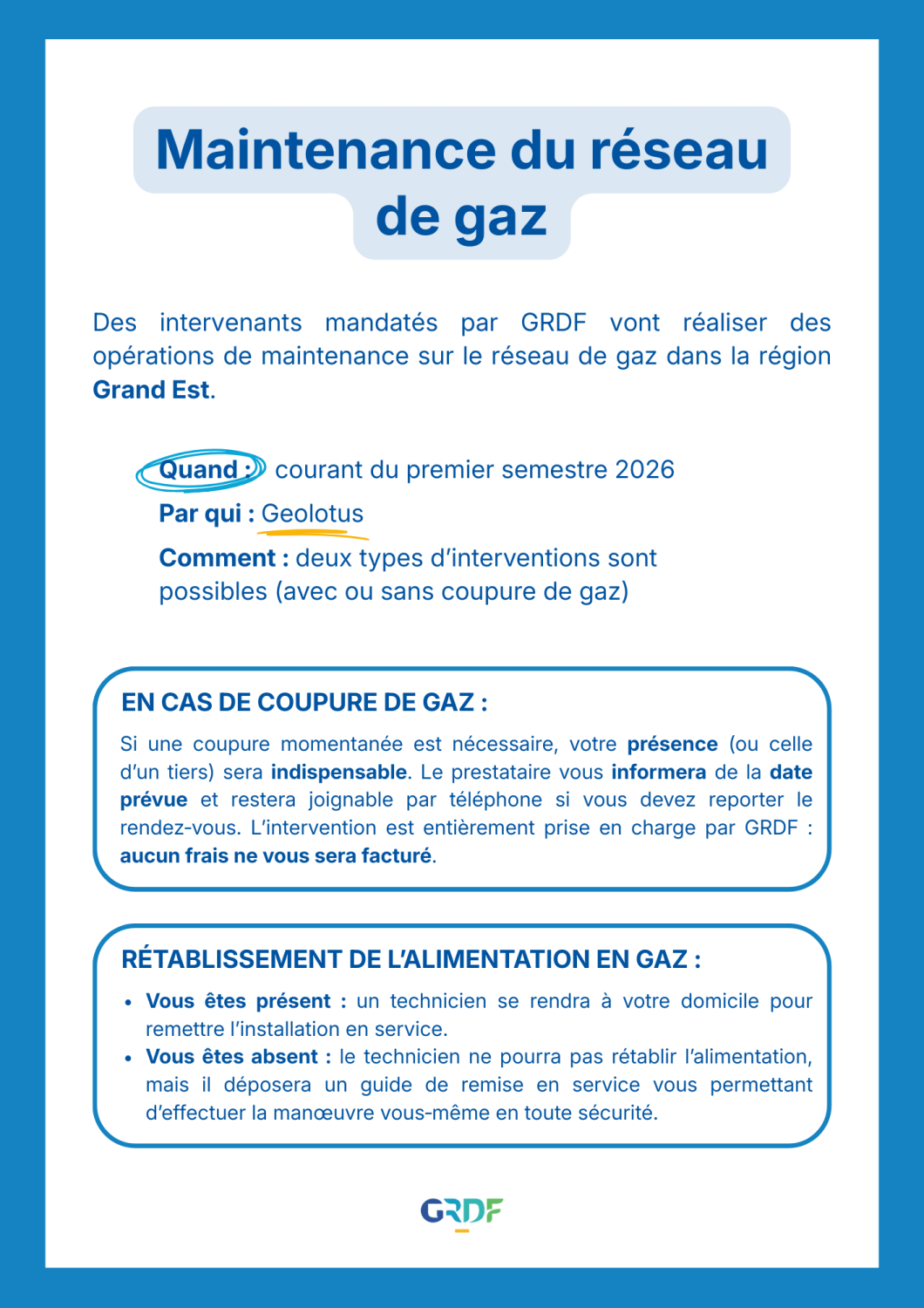 INTERVENTIONS SUR LE RESEAU DE GAZ EN 2026 Article publié le 13 mars 2026 Des interventions de sécurisation du réseau de gaz seront programmés par GRDF sur notre commune au courant du premier semestre 2026. Elles seront réalisées par l'entreprise GEOLOTUS. Documents à télécharger Portage-Collectivite-2026-INTERVENTION-SUR-RESEAU-GAZ.pptx