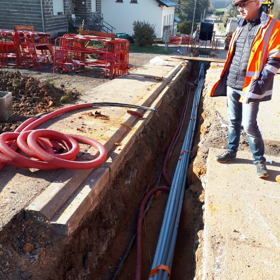 Les travaux dans la rue de la Croix se poursuivent à bonne allure grâce en partie à la météo idéale pour ce genre de chantier. Des tranchées qui accueilleront les fourreaux, gaines, câbles et fibres sont en cours de réalisation. La tranchée principale a déja été réalisée jusqu'à la salle polyvalente et les tranchées secondaires perpendiculaires à la principale et qui rejoignent respectivement l'ensemble des habitations sont déja en grande partie terminées. Pour ces dernières, l'entreprise est tenue de refaire le sol des abords des maisons identique à l'existant.