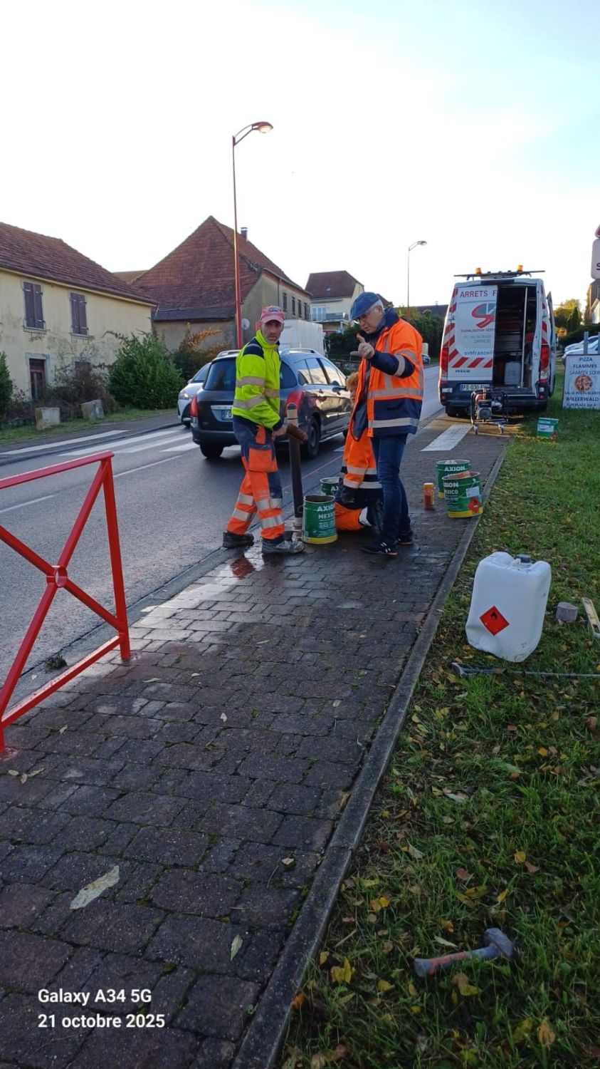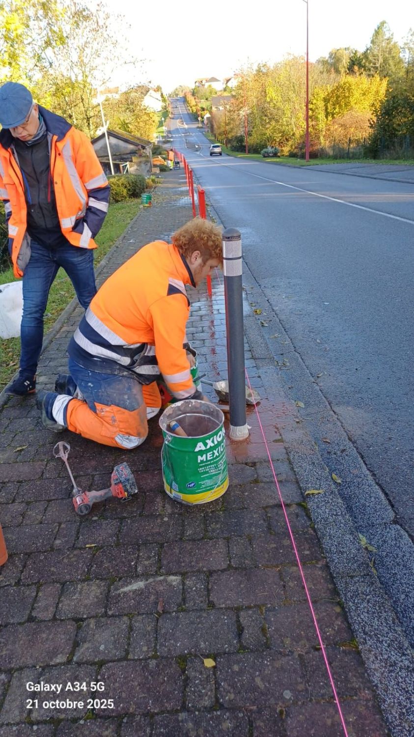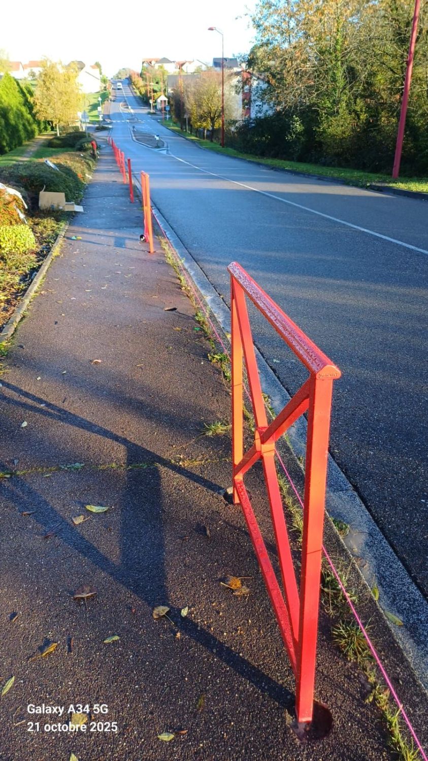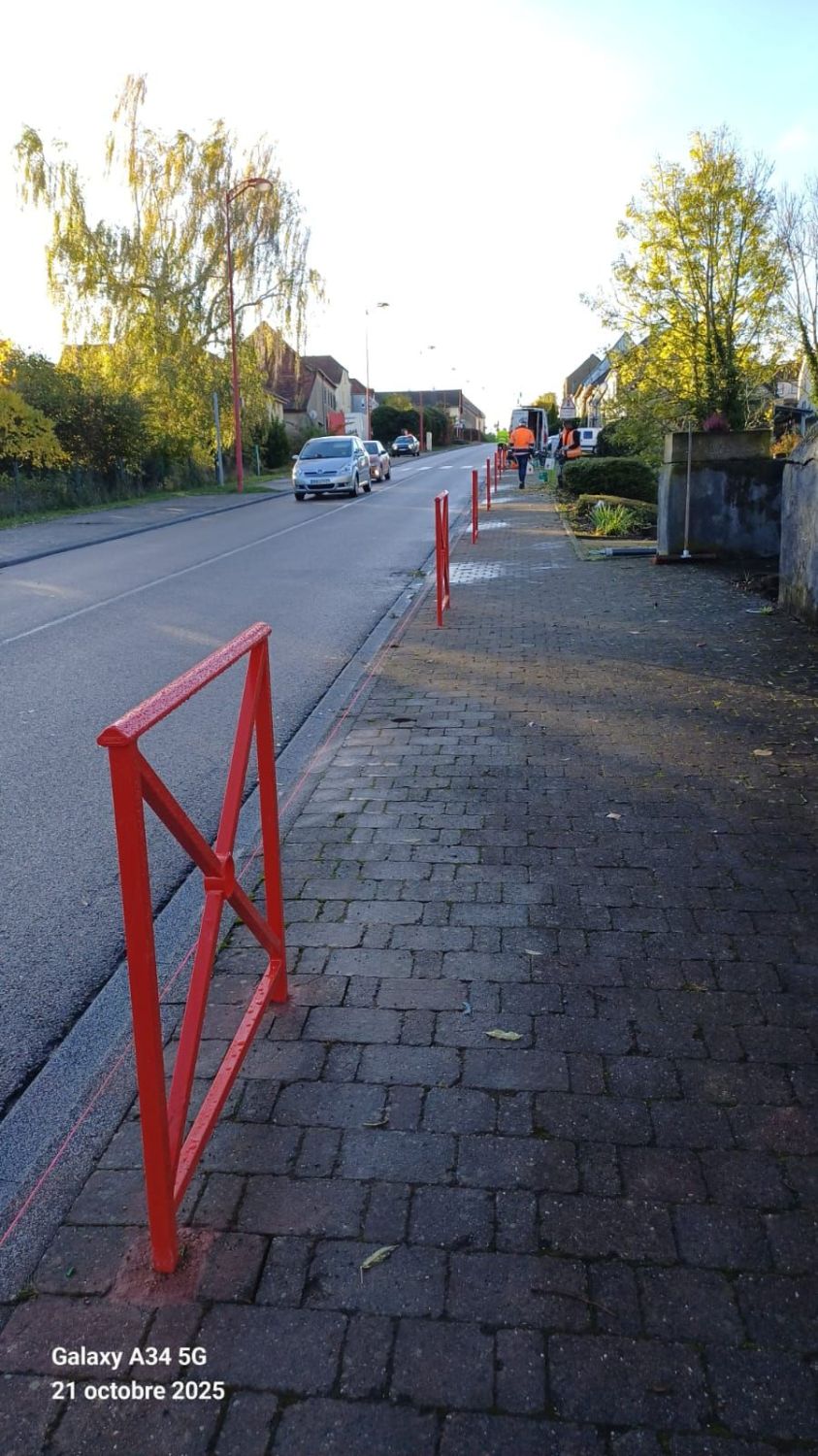 Afin de sécuriser le trottoir entre l'arbribus, à coté de la rue des Jardins, et la maison forte, des potelets et des barrières ont été scellés le long de la bordure afin de créer un effet d'optique incitant les automobilistes et surtout les chauffeurs de poids lourds à ralentir.